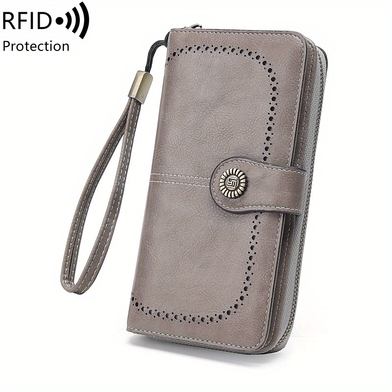 Vintage RFID Blocking Long Wallet – Large Capacity Zip Coin Purse with Wrist Strap